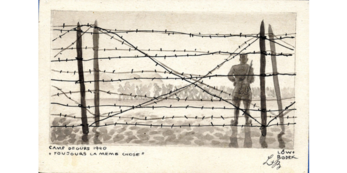 Kurt Löw et Karl Bodek, peintres et graveurs autrichiens de Vienne, sont inséparables dans la vie comme dans leur art. Plusieurs de leurs levis sont présentés dans les fiches précédentes. Ils étaient les décorateurs attitrés de la troupe Nathan, mais leur renommée auprès des internés provenait surtout des nombreuses cartes, pleines de fraicheur, qu’ils proposaient, à l’occasion des fêtes ou des anniversaires.