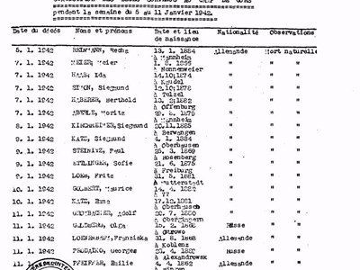 On trouvera par ailleurs la liste de l’ensemble des 1073 décès survenus au camp de Gurs de 1939 à 1945. Il n’est question ici que des décès survenus entre le 24 octobre 1940 et le 1er novembre 1943.